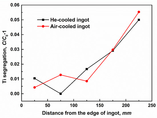 Quantitatively, the relative segregation of Ti, namely C/C0 − 1, is depicted in Figure 5. Because the samples were obtained from the top surface of the ingot, all the segregations are determined to be positive. In the late solidification, the accumulation phenomenon of solute is rather obvious due to its longer local solidification time. Thus, with the increase in distance from the ingot edge, the Ti segregation becomes more severe considering the solute enrichment caused by the interdendritic convection. It should be noted that, although there is a similar evolution tendency of Ti content in both ingots, quantitatively the maximum and minimum values of Ti segregation are lowered to 0.55 and 0, respectively, in the He-cooled ingot compared to the larger segregation of 0.055 and 0.0043 in the air-cooled ingot. In addition, besides the maximum and minimum segregations, the global macrosegregation extent of GM, which indicates the severity of compositional fluctuation in the whole section, is also a key indicator and its expression is below,