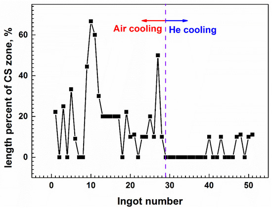 Statistics of the length percentage of the CS zone in the ingot body in Air-and He-cooled ingots.