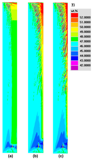 The macrosegregation distribution and evolution of Ti in the NbTi ingot. (a) 1000 s; (b) 2700 s; (c) 11,000 s. At 2700 s, a solidification front arrives appropriately at the half of the ingot. At 11000s, the solidification of the ingot is complete.