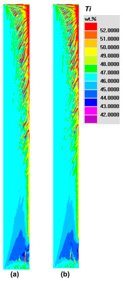 The effect of cooling rate on the final macrosegregation of Ti. The interface heat-transfer coefficients between mold and melt are increased to be 2500 (a) and 3000 W m−2 K−1 (b), respectively.