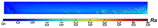 where R, G, ε are solidification speed, temperature gradient and cooling rate, respectively. In Equation (7), the solid fraction fs is selected on average as 0.15, in which it is always considered as the onset site of initiate channel segregation [31]. The distribution contour of Ra in the air-cooled ingot is depicted in Figure 12. It shows that, with the increase in distance from the side surface, the Rayleigh number increases first and then decreases. As mentioned above, the flow direction will be quickly overturned when solutal gradient governs the opposite temperature gradient with the development of solidification. Owing to the solute redistribution and accumulation of segregation, the density inversion becomes larger and, correspondingly, Ra also increases according to Equation (7). However, at the end of the solidification, the simultaneous solidification phenomenon occurs, and hence fast solidification lowers the Rayleigh number although the density contrast between the interdendritic liquid and bulk melt is large.