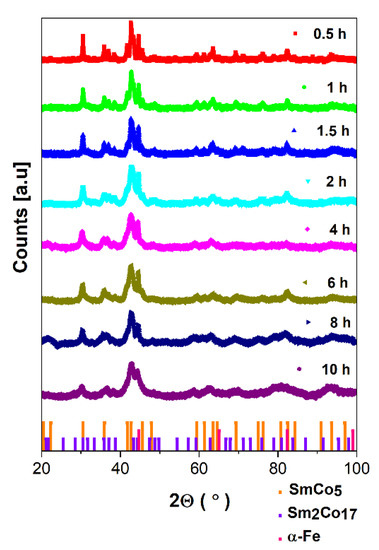 The XRD measurements were carried out at room temperature for all as-milled powders. The XRD patterns collected for all specimens are depicted in Figure 1. The subsequent broadening of diffraction peaks is noticed with the increase in milling time due to the reduction in crystallite size. It is worth mentioning that in XRD patterns, there is no evidence of other impurity traces, namely, from the ZrO2 milling media or samarium oxide. The observed broadening of diffraction peaks is associated with the gradual amorphization upon the duration of the grinding process manifested mainly as a significant decrease in crystallite size. As the next effect of mechanosynthesis, visible differences in the peak intensity are observed due to the separation of various crystal phases, the shape and size effects and the varied texture related to different orientations of the crystallites in the grains/particles.