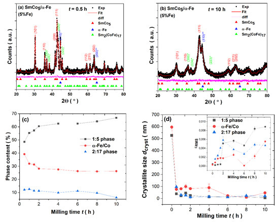 (a) Rietveld refinement of XRD pattern for SmCo5/α-Fe (5%wt. of α-Fe) powders milled for (a) t = 0.5 h; (b) t = 10 h. (c) The phase content of 1:5, α-Fe/Co and 2:17 phases, and (d) variation in crystallite size dcryst and lattice strain εRMS (insert) over t milling time.
