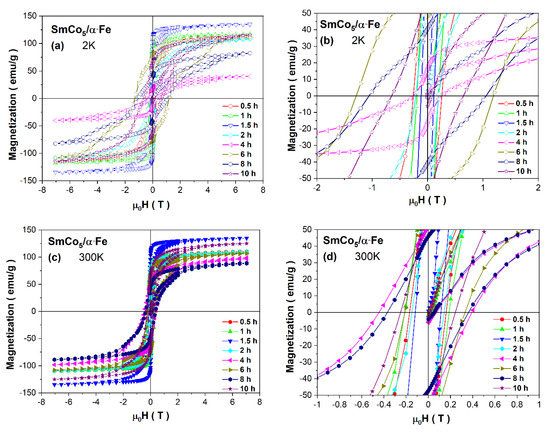 Moreover, there is also a second maximum which is a proof for a mixture of uncoupled soft and hard phases [52]. In our case, at low temperature, we can see a relatively narrow peak just up to t = 2 h of the synthesis process, where we also note a significant increase in the 1:5 phase and a decrease in the α-Fe phase. For the higher milling time, the maximum is reduced and is shifted towards 0 T, which probably indicates that some Fe crystallites are not perfectly coupled. An additional maximum for t = 6 and 10 h is also observed, which can testify to the reduction in coupling and the significant crystallite size distribution. At room temperature, the variation in the dM/dH peaks is similar. It is worth mentioning that in both cases, the peaks’ width and long tails can indicate a significant percentage of crystallites which are not well coupled. Thus, the intensity of dM/dH peaks around HC is relatively weak, pointing to the low contribution of a well-exchange-coupled composite, whereas the domination of the highest peak around small fields reveals the main contribution of a non-coupled soft magnetic phase. A visible shoulder at higher magnetic fields may correspond to a non-coupled hard magnetic phase. The interpretation of such curves is also rather unobvious due to the possible interdiffusion Co/Fe process.