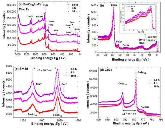 The survey spectra measured after ion cleaning by an Ar+ beam for about 1 h are presented in Figure 8a. The main photoemission lines Sm3d, Co2p, Fe2p, Sm4p, Sm4d, Co3s and Co3p and the Auger CoLMM and FeLMM lines are denoted. There is no drastic change in all spectra collected for samples synthesized for t = 0.5, 4 and 10 h. The chemical composition estimated based on survey spectra acquired before and after ion cleaning is determined for comparison (see Table 3). The evident difference between both values is related to a significant quantity of surface impurities noted before using the Ar+ beam. After ion cleaning, the amount of C1s and O1s is significantly reduced. Note that the atomic concentration of iron and cobalt may be slightly disturbed due to the overlapping of 2p core lines with the Auger LMM lines.