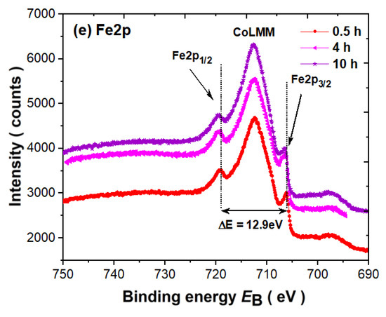 The Co2p3/2 (BE ≈ 777.6 eV) and Co2p1/2 (BE ≈ 792.7 eV) core level spectra are plotted in Figure 8d. The L–S splitting is stable during sample processing and equals about ΔE ≈ 15.1 eV. The Fe2p lines (see Figure 8e) are split into Fe2p3/2 (BE ≈ 706.6 eV) and Fe2p1/2 (BE ≈ 719.5 eV), with a splitting parameter of about ΔE ≈ 12.9 eV typical for metallic iron. Obviously, the CoLMM Auger line as the dominant component is overlapped with Fe2p. Nonetheless, the Co2p, as well as Fe2p, lines are shifted to a higher BE of about 0.2 eV, and such energy shifts can be caused by: (i) a change in the local environment of Co atoms induced by the modification of the phase content throughout the synthesis duration and (ii) the influence of hybridization of the Co3d states with Sm 5d6s and Fe3d, as well as conduction states. Generally, such chemical shifts, when compared to the corresponding pure metals, reveal a charge transfer from the Sm rare-earth to (Co/Fe)3d band. The observed chemical shift is usually larger for Sm-based compounds due to the mixed valence of Sm ions [69,70].