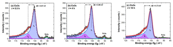 The results of the Co3s spectra fitting for powders milled for 0.5, 4 and 10 h are depicted in Figure 9. It is worth mentioning that the quantity of iron in the tested nanocomposites is too low to observe similar splitting to Co3s states, and that is why only one single peak around 90.5 eV can be noticed. Thus, all shown Co3s spectra were fitted by using an asymmetric Doniach–Sunjić (DS) type of line [55] with the same asymmetry parameter α for both IA and IB peaks as it was previously performed for other compounds [33,34,50,51,52,53,54]. All parameters obtained from the applied fitting procedure are presented in Table 4. As we have observed, the Co3s lines for all measured powders exhibit quite significant splitting. Laslo et al. [80] already performed Co3s analysis for the series of RCo5 compounds and the estimated ΔE parameter for the SmCo5 compound equaled 3.5 eV, which is significantly lower than that obtained by us. However, the presented results suggest that the authors did not use the typical asymmetric line shape in the fitting procedure, which is usually applied for 3s lines [72,73,74,75,76,77,78]. Nonetheless, the ΔE parameters obtained by us are close to those previously noted for pure Co, where they were found to be about 4.5–4.7 eV [72,73,74,75,79,80]. However, the value of the estimated cobalt magnetic moment is significantly lower than for pure Co (1.7 µB) [79], probably due to the presence of α-Fe in the nanocomposite. Moreover, the increase in the milling time is reflected in a visible increase in (i) the Co magnetic moment and (ii) a slight increase in the 3s–3d exchange integral J3s-3d values within the experimental uncertainty. The observed phenomena are related to the increase in the 1:5 phase and the reduction in α-Fe over the milling time as a consequence of the variation within the 3s–3d interaction due to hybridization effects within the (Co/Fe)3d band. The observed changes are also consistent with the VB, especially with the evident increase within the intensity of states at the Fermi level (see insert in Figure 8b).