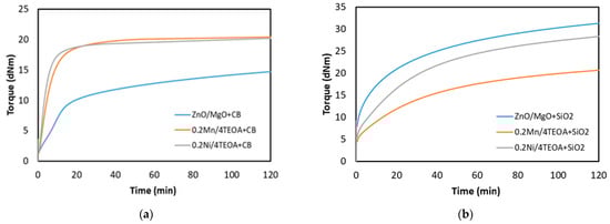 Rheometric curves at 160 °C for the CR compounds: (a) filled with carbon black (CB); (b) filled with SiO2.