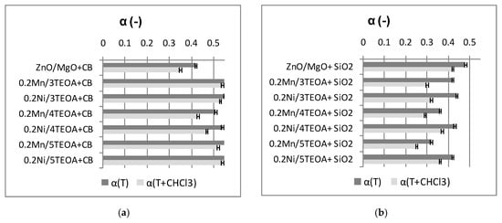 Another parameter related to the efficiency of the crosslinking process is the degree of crosslinking calculated on the basis of equilibrium swelling in toluene, which is presented in Figure 2. No significant influence of the type Me(acac) used or the content of TEOA on the crosslinking degree of CR vulcanizates was observed. On the other hand, the effect of the filler applied is evident. Me(acac)/TEOA systems exhibited higher activity in the crosslinking of CB-filled rubber compounds resulting in higher crosslinking degree of the vulcanizates compared to those containing SiO2. Vulcanizates containing CB were characterized by αT values in the range of 0.51–0.60, when those containing SiO2 revealed αT values in the range of 0.32–0.44. As mentioned before, lower efficiency of the proposed curing system in the presence of SiO2 may result from adsorption of the Me(acac) on the surface of SiO2, due to its polar character. When compare to the reference curing system, which contained ZnO and MgO, using Me(acac)/TEOA resulted in a slightly higher αT of the CB-filled vulcanizates, whereas for SiO2-filled CR αT were slightly lower than that of the benchmark. However, considering the experimental error, it could be concluded that Me(acac)/TEOA curing systems did not significantly affect the crosslinking degree of the CR elastomer compared to ZnO/MgO.