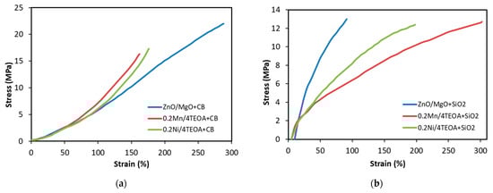 The filler and the curing system used had a significant influence on the stress-strain curves of CR vulcanizates, and so their tensile properties. Higher activity of the Me(acac)/TEOA curing systems in the crosslinking of CB-filled CR resulted in the higher tensile strength of the vulcanizates in comparison to SiO2-filled elastomers. Moreover, the high crosslinking degree of the CB-filled vulcanizates cured with Me(acac)/TEOA systems resulted in their worse mechanical properties (lower tensile strength (TS) and elongation at break (EB)) in comparison to vulcanizate cured with ZnO and MgO (Figure 3a). On the other hand, application of nanosized silica resulted in increased stiffness, when compared to CB-filled vulcanizates, which is especially visible at the very beginning of the stress-strain plots. However, lower activity of the Me(acac)/TEOA curing system in SiO2-filled CR resulted in higher EB of the vulcanizates compared to the benchmark cured with metal oxides (Figure 3b), but quite comparable TS.