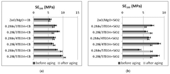 Influence of thermo-oxidative aging on the stress at 100% relative elongation (SE100) of the vulcanizates: (a) filled with CB; (b) filled with SiO2.