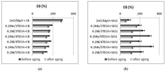 The reduction in EB of the vulcanizates after aging process (Figure 5) may result from the increase in the elastomer crosslinking degree. Undeniably smaller changes in EB were observed for the vulcanizates containing CB compared to SiO2-filled elastomer. In case of SiO2-filled vulcanizates, definitely lower EB values after the aging procedure may also confirm some further crosslinking reaction between CR and SiO2. For both fillers, the lowest changes in EB were achieved for the reference vulcanizates containing ZnO/MgO.