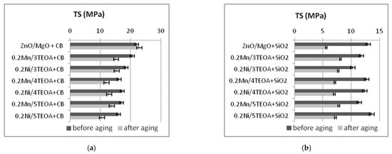 Influence of thermo-oxidative aging on the tensile strength (TS) of the vulcanizates: (a) filled with CB; (b) filled with SiO2.