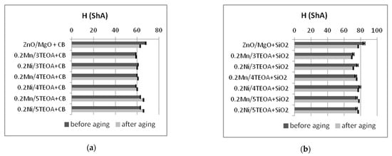 The effect of thermo-oxidative aging on the hardness of the vulcanizates is presented in Figure 7. As it was for Af, the influence of the curing system used on the aging resistance of the vulcanizates is evident. Considering ZnO/MgO-containing elastomers, thermo-oxidative aging reduced the hardness of the vulcanizates by 5–7 ShA compared to the non-aged samples. In the case of Me(acac)-cured rubber compounds, smaller changes in H values were observed regardless of the filler used (1–3 ShA for most of the vulcanizates).