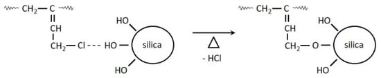 Furthermore, in Figure 2 the differences between the degree of elastomer crosslinking determined in toluene (αT) and toluene in chloroform vapor (αT+CHCl3) are shown. Those differences may indicate the presence of non-covalent network nodes (crosslinks) in the structure of the elastomer, which may improve the mechanical strength of the CR vulcanizates. More pronounced differences between αT and αT+CHCl3 values were determined for the vulcanizates containing SiO2. It should be noted that for the SiO2–filled vulcanizates, these differences may result not only from the formation of non-covalent crosslinks in the elastomer network, but also from the interactions between precipitated silica and CR, i.e., formation of some weak bonds between CR and SiO2, which were destroyed in the presence of chloroform vapor. Choi [48] and Das et al. [49] proposed the interaction between the chlorine from CR and the hydrogen atom from the silanol group of silica through the hydrogen bonds. On the other hand, Sae-oui et al. [45] confirmed the probable mechanism of interactions between the silica surface and CR, which was previously proposed by Wang et al. [50]. According to this mechanism, at high temperature, the bond formation between reactive allylic chlorine atoms and the silanol groups of silica occurs with a release of HCl, as shown in Scheme 2 [45].
