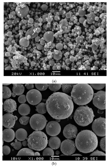 Figure 1 shows the particle morphologies observed using a JSM-6460LA model Scanning Electron Microscope (JEOL, Peabody, MA USA) for the samples coated with platinum (Pt). The majority of fly-ash particles (Figure 1a) have diameters of ~40–60 mm, while the glass bubble particle (Figure 1b) have diameters of ~60 to 80 mm. The chemical composition of fly ash and glass bubble was obtained using X-Ray Fluorescence spectroscopy (XRF) with a PANanalytical MiniPAL 4 x-ray spectrometer (Philips, Brighton, UK) and the primary composition of fly ash is SiO2 (55.9%), Al2O3 (28.1%), Fe2O3 (6.97%), and CaO (3.84%), while in the case of the glass bubble, its primary composition is SiO2 (68.5%), Na2O (9.90%), and ClO2 (15.6%).