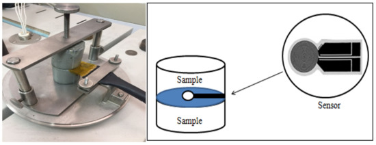 A recently developed thermal measurement technique utilising the hot strip method is called the transient plane source (TPS) technique, or the hot disk (HD) or Gustafsson probe, proposed by Gustafsson [46]. The transient measurement consists of the hot wire technique, which is mostly used for quantifying the thermal conductivity of solid non-electrically conducting materials, including cementitious materials. Relative to the steady-state methods, this technique keeps the temperature constant, which guarantees accurate measurements [41,47,56,62]. The testing is performed by recording the voltage/resistance variations when the plane sensor element is electrically heated (electrical current pulse) [63]. The value of its electric resistance R(t) in the sensor can be represented as a function in terms of the average temperature increase ∆T(t) of the sensor element in the first approximation in Equations (7) and (8), as: