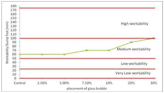 The workability of the glass bubble loaded geopolymer concrete is shown in Figure 3. The slump values of the geopolymer concrete glass bubble loadings (0, 2.5, 5.0, 7.5, 10, 20, 30%) were found to be 60–100 mm, which translates to a value increment of ~16% relative to its unloaded (with glass bubble) counterpart.