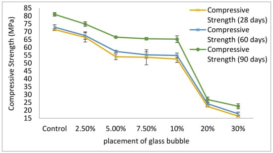 The effect of glass bubble loadings (0, 2.5, 5.0, 7.5, 10, 20, and 30%) on the compressive strength based on effect of aging days (28, 60, and 90 days) has shown in Figure 6. A general decrease of the geopolymer concrete’s compressive strength is evident, from its highest at 71.4 MPa (zero loadings of glass bubble) to its lowest at 16.4 MPa (at a 30% loading of glass bubble).