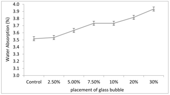 Figure 7 shows the effect of loading of glass bubble (0, 2.5, 5.0, 7.5, 10, 20, and 30%) with respect to the percentage of water absorption for 28 days. Water absorption represents the primary mechanism for water and water vapour transport in concrete where commonly lower water absorption characteristics of concrete will increase the structure’s lifespan.