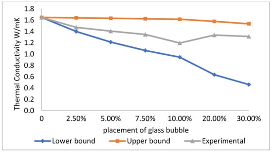 Figure 8 shows the thermal conductivity of geopolymer concrete for different loadings of the glass bubble. It can be seen that the control geopolymer concrete sample has a thermal conductivity of 1.65 W/mK and a density of 2247 kg/m3. The general trend in the plot seems to be an inverse relationship between glass bubble loading and thermal conductivity, where the thermal conductivities of 1.47, 1.41, 1.35, 1.19, 1.34, and 1.31 W/mK corresponded to 2.5%, 5.0%, 7.5%, 10.0%, 20.0%, and 30.0% glass bubble loading, respectively, resulting in an overall decrement of 20.44% in thermal conductivity. It is also evident in Figure 8 that the measured values of the thermal conductivities lie between the upper and lower bounds of the (calculated) theoretical values, which was expected.