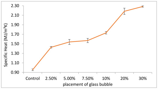 Measured specific heat (with standard deviations indicated by error bars) for geopolymer concretes with different percentage placement of glass bubble.