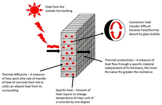 The thermal (insulating) properties of concrete buildings are crucial for environmental sustainability via respective energy consumption [10,11]. The improvement of buildings’ thermal insulating properties could help regulate their internal temperatures and minimise their (energy-intensive) heating and cooling systems. However, improvements of thermal insulating properties usually come at the cost of the concretes’ physicomechanical performance, making up the buildings [12,13,14,15,16,17]. The improvement to thermally insulating properties while maintaining the concrete’s physicomechanical properties can be realised via the use of novel geopolymer concretes embedded with a glass bubble acting as its thermal insulation material. The thermal conductivity, specific heat, and thermal diffusivity of the thermal insulation materials embedded within the geopolymer concrete would enhance the residential and commercial buildings’ energy efficiency (Hu, Wang, & Ge (2012)) [10]). A material is regarded as an excellent insulating material is its thermal conductivity and diffusivity are low, and its specific heat high, properties that are especially crucial in concrete buildings situated in harsh climatic conditions.