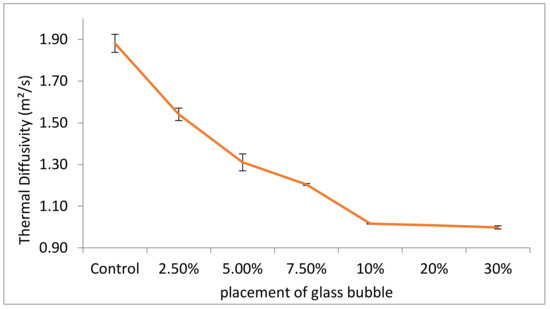 Measured thermal diffusivity (with standard deviations indicated by error bars) for geopolymer concretes with different percentage placement of glass bubble.