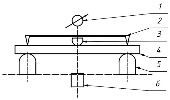Scheme of prototype creep testing machine (1—micrometer; 2—deflectometr; 3—thrust; 4—sample; 5—suports; 6—load).