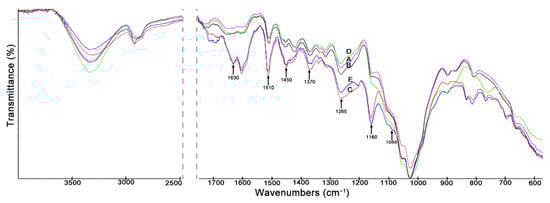 The ATR-FTIR spectra of Scots pine wood (A), wood treated with 70% EtOH (B), wood treated with EEP (C), wood treated with MPTMOS-TEOS (D), and wood treated with EEP-MPTMOS/TEOS (E).