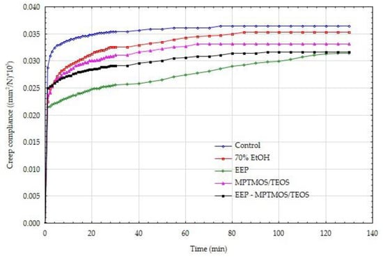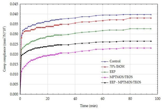Wood is a natural composite with a hierarchical structure. At the molecular level, cellulose, lignin, and hemicellulose are the main components of wood. Cellulose, which is an elastic polymer has a very small influence on the viscoelastic matrix, but lignin and hemicellulose present much more viscous behavior [48,49,50,51]. Moreover, lignin is the main component of middle lamella, which is a bonded layer connecting two adjacent cell wall and encrusting the cellulose skeleton [52]. The literature date indicate that aqueous ethanol solution dissolves a main part of lignin from the middle lamella, releasing the individual cells at sectioning [34,35]. The ethanol solution also caused the weakening of bonds between compound middle lamella and S1 layer [34,53]. The presented results indicate that wood samples impregnated with 70% EtOH showed the highest relative creep compliance in dry wood condition. Therefore, our hypothesis is that the ethanol–water mixture, which was used in the study as a solvent in impregnating formulations, could be one of the determinants of the changes occurring in the tests of treated wood creep. In turn, the lowest relative creep compliance observed in case of wood treated with the EEP-MPTMOS/TEOS could be connected with different mechanism. The constituents of propolis extract, especially when it is mixed with silicon compounds form bonds with wood, which is confirmed in the ATR-FTIR analysis. In this case, the negative effect of 70% ethanol could be compensated by permanent bonding of propolis constituents with wood components.