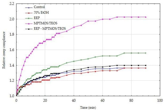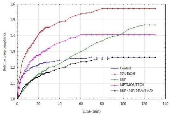 The analysis of the data presented in Figure 5 and Figure 6 shows that in the initial stage of creep, the values of relative creep compliance increased relatively quickly for all variants of the experiments. In dry wood, a large dispersion of individual variants can be observed. The control wood and wood protected with EEP-MPTMOS/TEOS solution showed the lowest relative creep compliance. The course of both curves is similar after approximately 60 min, but initially the control wood showed a higher relative creep susceptibility. The relative creep compliance curves in wood with a moisture content above the fiber saturation point are more closely related. The exception is the relationship for wood protected with the MPTMOS/TEOS solution, where the average value of the relative creep susceptibility is almost twice as high as the others.