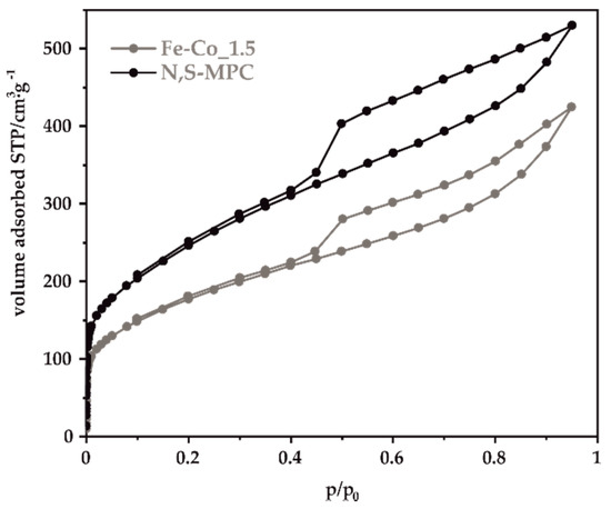 The N2-sorption isotherm for the N,S-MPC support and Fe-Co_1.5 samples.