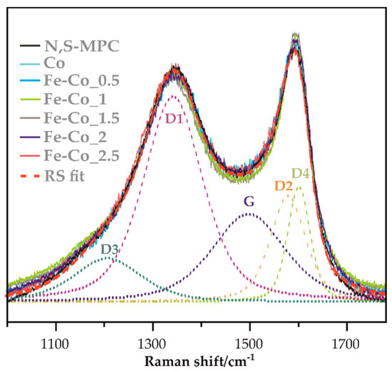 Raman spectroscopy, being sensitive to local structure, confirms that upon increasing the iron content the samples with mixed phase composition are obtained (Figure 3b). For instance, in the case of Fe-Co_0.5/N,S-MPC with low Fe content, five bands at 192, 477, 512, 612, and 683 cm−1, corresponding to the Eg, 3xF2g, and A1g vibrational modes, confirm the normal iron-cobalt spinel structure [48]. Enhancement of the Fe concentration leads to the appearance of structural changes, manifested by broadening and shifting of the bands towards lower wavenumbers in the Raman spectra [49]. Moreover, for the catalysts where the amount of iron is larger than cobalt additional bands at 223, 289, and 407 cm−1 can be distinguished, which were assigned to A1g (Fe2O3), Eg (Fe2O3, Fe3O4) and Eg (Fe2O3) vibrational modes. Additionally, it is suggested that the band at ~610 cm−1 is a superposition of two bands associated with the presence of both mixed iron-cobalt spinel and Fe2O3 [50].