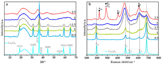 The elemental composition of the obtained Fe-Co oxide active phase was determined by the XRF method. The atomic ratios of Fe:Co in the synthesized samples, summarized in Table 2, are highly compliant with the intended values. Moreover, the amount of the oxide phase deposited on the mesoporous carbon matrix was evaluated based on the thermogravimetric analysis, carried out in the flow of air (Table 2). A weight loss of ~70% determined for all the examined catalysts confirms the expected oxide phase loading. The structure and phase composition of the obtained oxide materials deposited on the N,S-MPC carrier were elucidated by means of the X-ray powder diffraction and Raman spectroscopy. The obtained results confirmed the presence of iron-cobalt spinels crystallizing in the cubic Fd3m structure (Figure 3a). Furthermore, due to the use of the carbon support, a wide peak at ~23° related to the graphite plane (002) can also be distinguished in all cases [47]. However, depending on FexCo3−xO4 stoichiometry the XRD patterns and RS spectra revealed the presence of additional segregated oxides for x > 1.5. The extent of incorporation of the iron to the cobalt spinel structure determines the distribution of the Fe cations into the tetra- and octahedral positions, deciding about the normal or inverse spinel structure. The recorded diffractograms of the samples with x varying between 0.5 and 1.5 indicate that a normal iron-cobalt spinel was achieved. Moreover, with the increasing iron content in this range, a noticeable broadening of the diffraction peaks was observed, suggesting that smaller spinel crystallites were obtained.