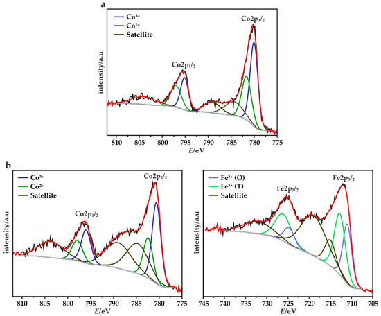 In order to obtain the cation oxidation state and the surface chemical composition of the obtained catalysts, X-ray photoelectron spectroscopy (XPS) measurements were conducted. The fitted XPS spectra for the Co 2p and Fe 2p region for the Co3O4 and Fe-Co_1.5 samples are shown in Figure 4, and calculated chemical composition of the spinels are given in the Table 3. In the case of the mixed iron-cobalt spinel due to the occurrence of an Auger peak from the other respective metal which overlays mainly the 2p3/2 part of the spectra the interpretation is not straightforward [51,52]. The spectra of Co 2p show two asymmetric peaks which can be assigned to Co 2p3/2 and Co 2p1/2 together with corresponding satellite structures.