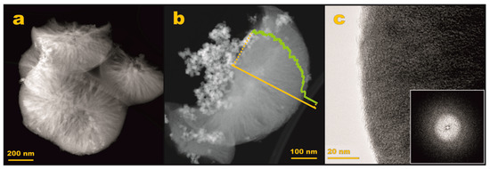 The shape and morphology of the mesoporous carbon support were examined by transmission electron microscopy, and the obtained results are presented in Figure 5. As can be seen in Figure 5a, the Z-contrast changes along the carbon support grain, indicating variations in their thickness. The character of these variations suggests the presence of microporosity of the examined material. A more detailed insight into the morphology is presented in Figure 3b, where the indicated intensity profile shows that the thickness increases from the edge of the carbon grain towards the center (cf. green line in Figure 5b). Such features along with the rounded shape imply that the vast majority of the carbon support particles exhibit an overall spherulitic shape, characteristic for the operation of a diffusion limited growth mechanism. A high-resolution TEM image (Figure 5c) shows the amorphous (confirmed by FFT analysis, Figure 5c inset) nature of the carbon support grains with the mesopore’s network running preferentially from the center to the edge.