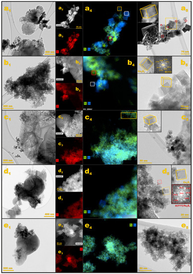 To elucidate dispersion, elemental composition, and morphology of the oxide active phase a detailed microscopic TEM, HAADF/STEM, and EDX analysis for each iron-cobalt spinel sample were carried out. The results are presented in Figure 6 for the Fe-Co_0.5 (a1–a5), Fe-Co_1 (b1–b5), Fe-Co_1.5 (c1–c5), Fe-Co_2 (d1–d5), and Fe-Co_2.5 (e1–e5) samples.