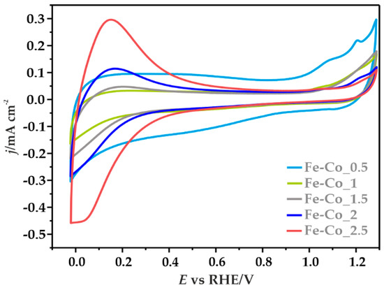 The redox properties of the obtained catalysts were determined by cyclic voltammetry in an Ar-saturated electrolyte at the scan rate of 10 mV s−1 (Figure 7). In the case of Fe-Co_0.5/N,S-MPC two distinct oxidation peaks were recorded at ~1.07 and 1.20 V, along with a slight reduction peak at ~1.13 V, which are related to the following reactions [56]: