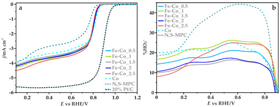 In the potential range of 0.1–0.5 V, the average number of electrons (determined by the RRDE method) changed in the following order: 3.73 for Fe-Co_1.5 > 3.71 for Fe-Co_2 > 3.66 for Fe-Co_2.5 > 3.65 for Fe-Co_0.5 > 3.56 for Fe-Co_1, whereas for the N,S-MPC support, and the Co/N,S-MPC catalyst it was equal to 3.36 and 3.57, respectively. Despite that for the catalyst with x = 2.5 the maximum on the profile representing the formation of versus potential is relatively high (Figure 8b), a quite large average number of the transferred electrons was noted. This is due to the fact that after reaching the maximum, a much faster decrease in the production of was observed for the Fe-Co_2.5 catalyst in comparison to the other samples. It suggests a further reduction of the generated species, leading to an ensuing increase in the contribution of the sequential ORR pathway (2e− + 2e−) as the potential decreases.