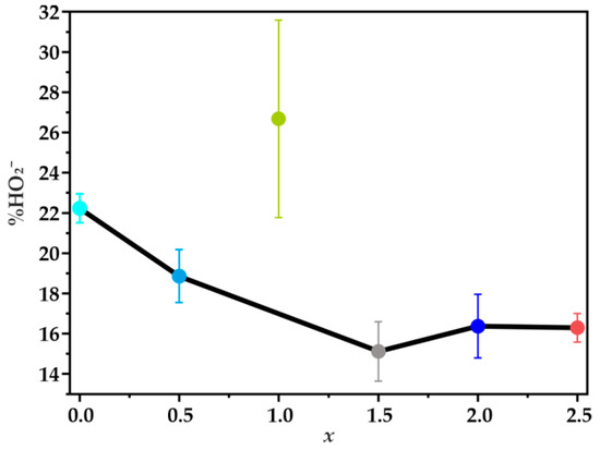Figure 8b presents the percentage content of oxidized on the ring electrode as a function of the potential applied to the disc electrode. Production of peroxide on the studied catalysts begins at the potential ~0.85 V, then it rises sharply until reaching the maximum value at around ~0.55 V. The highest amount of the intermediate product at this potential value is the result of the use of the doubly promoted carbon support, which in an alkaline environment is able to reduce oxygen mainly through a two-electron pathway, leading to the formation of peroxide intermediates [63,64]. The average percentage of the formed (in the range of 0.1–0.5 V) is about 32% for N,S-MPC, whereas for the Fe-Co catalysts it varies from 14% to 22%. A very similar value of ~22% was observed for the reference cobalt spinel electrocatalyst supported on the same N,S-MPC carrier. As the applied potential decreased further, a decline in the production of hydrogen peroxide was observed, which indicates an increased contribution of the four-electron reaction pathway. The lowest amount of the formed intermediate products in the almost entire potential range, and thus the highest number of transferred electrons, was registered for the catalyst at x = 1.5.