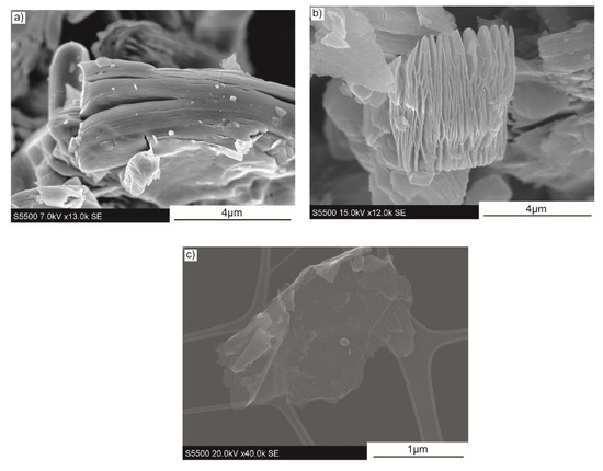The morphology of Ti3C2 is presented in Figure 1. To confirm the effectiveness of the production method, powder was examined after each technological step. Figure 1a shows the Ti3AlC2 MAX phase after SPS synthesis and the following grinding process. The close packed, layered structure can be observed, as Al atoms bond together subsequent layers. The synthesised MAX phase consisted dominantly of Ti3AlC2, along with a small amount of TiC and unreacted graphite, as presented in the XRD results in our previous study [47]. The powder structure after the HF etching process is presented in Figure 1b. As a result of Al atoms’ removal, the subsequent separated Ti3C2 layers are easily visible. The morphology of the synthesis final product, the MXene phase, is shown in Figure 1c. The carried-out resulted in obtaining few-layered particles of Ti3C2, characterised by a flake structure with a lateral size of a few microns.