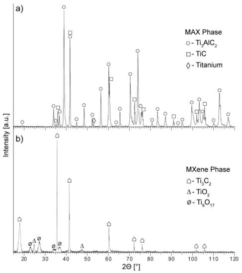 In addition to SEM observations, the phase analysis of synthesised MAX phase and final MXene phase was performed. The obtained diffraction patterns are presented in Figure 2. In the case of MAX phase, diffractogram reveals Ti3AlC2 as the dominant component, which confirms the effectiveness of the production method. Additionally, some TiC phase as a result of synthesis and small amounts of unreacted titanium can be observed. The diffraction pattern for MXene exhibits signals characteristic for Ti3C2, which is the dominant phase [55]. This proves that the adopted procedures of etching and delamination have been successful. The presence of titanium oxides was also identified in the diffractogram, which is typical for the Ti3C2 MXene phase [56].