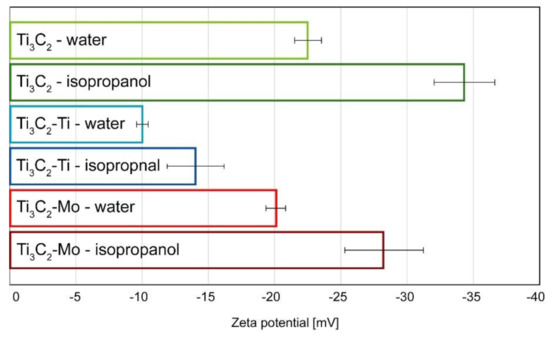 The zeta potential measurements for pristine Ti3C2 phase as well as that modified with Mo and Ti, in both water and isopropanol, are shown in Figure 4. By analysing these results it can be concluded that the examined phases are more stable in isopropanol than in water, regardless of the modification. This is due to the fact that MXene phases disintegrate in the aquatic environment. Such results were previously presented by other authors, who proved in their research that water, not oxygen, plays a key role in the degradation process of MXenes [63]. The unmodified Ti3C2 phase in isopropanol is characterised by highest stability, its zeta potential was about −35 mV. Applied modifications resulted in a decrease of zeta potential for Ti/Mo modified MXenes, regardless of the medium. Comparing the specimens with metallic layers, Ti3C2-Mo showed greater stability than Ti3C2-Ti, in both water and isopropanol.
