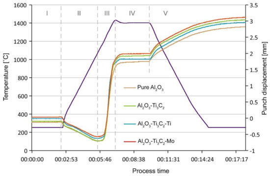The sintering curves obtained for composites with 1 wt.% addition of Ti3C3/Ti3C2-Ti/Ti3C2-Mo and for unreinforced Al2O3 samples are shown in Figure 5. The recorder shrinkage profile is characteristic for the SPS process, and was previously reported in other studies [64,65]. The displacement curve can be divided into five segments (I-V), separated in the figure with dashed lines. In the first section, specimens are heated from room temperature to the point of the pyrometer working range (250 °C), and no punch movement was noted. Further heating leads to thermal expansion of graphite components (mould and punches), responsible for negative piston displacement in segment II. In the next section, a change in the punch movement direction can be observed, followed by its rapid increase. This results from started compaction, in which takes place such phenomena as particles necking and mass transfer. In the fourth section, the final sintering temperature is reached, and pores present in the material are being sealed. This segment plays the crucial role, as it helps to evaluate the stage of densification. The course of punch displacement is identical for all sinters (pure alumina and composites, regardless the modification), and reaches the plateau zone. This suggests that the sintering parameters were well chosen, and all of the specimens reached full possible densification. It is also important to note that the entire SPS consolidation took only 18 min. Such a fast process should help in preventing the MXene phases from degradation.