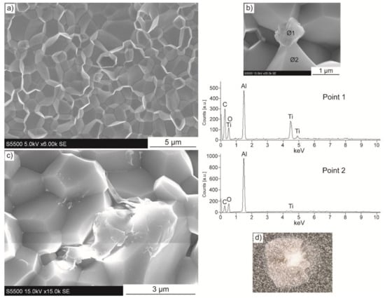 The microstructure of composites with Ti3C2 is presented in Figure 6a–c. In addition to the observations performed, the EDS detector was used to reveal the chemical elements present within the sinters. In Figure 6a, a dense microstructure with fine isometric grains that is free from pores can be seen. Such observations correlate very well with high densities of these sinters. It is important to note that there is no evidence of layered MXene phase within the microstructure. Interestingly, the fracture mode of the specimen is purely intergranular. Except for the ceramic matrix grains, only single other particles were observed. However, they are characterised by a spherical structure as shown in Figure 6b, in contrast to two-dimensional Ti3C2 used as starting material. EDS analysis revealed a high amount of titanium and carbon for point 1 (corresponding to additional structure), as well as aluminium and oxygen for point 2 (corresponding to alumina grains). Interesting observations were made for the composite with 2 wt.% of Ti3C2 addition, as presented in Figure 6c. They reveal the presence of a second phase with unidentified structure, and high porosity in the close area. In addition, Figure 6c presents the Vickers indenter imprint for composites with 0.5 wt.% of Ti3C2. Enormously cracked area with many spatters can be observed, making the mechanical properties’ measurements impossible to perform.