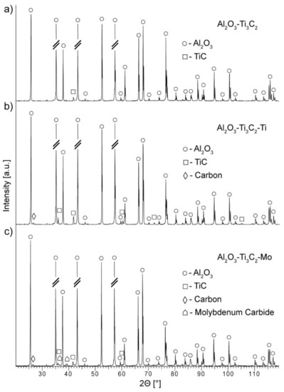 In order to determine the character of the presented structures, phase composition analysis was performed. The XRD patterns for composites with 2 wt.% of each of the additions are presented in Figure 9a–c. Except for the Al2O3 ceramic matrix phase, TiC was identified for each of the specimens, regardless of the addition. It is important to note that typically Ti3C2 phase undergo an oxidation process following the reaction: Ti3C2 + 3O2 = 3TiO2 + 2C [69]. As experimentally proved, this rule applies especially to a water-rich environment, and to a lesser extent to the presence of oxygen [70]. In contrast, the phenomenon of TiC formation has been previously reported for the processes carried out in the vacuum [71]. Authors explained that high temperatures induce rearrangement of Ti and C atoms in the MXene phase, with an outcome of cubic TiC recrystallisation. In the present study, diffractograms for all specimens show peaks corresponding to this phase formation. Interestingly, no presence of TiO2 or Ti3C2 was detected within the diffraction pattern. In addition, some amount of free carbon was detected within composites with Ti (Figure 9b) and Mo (Figure 9c) modified additions. For the latter, a small peak corresponding to molybdenum carbide is also visible. This is consistent with literature reports on Mo2C creation [72]. It synthesises at elevated temperatures through carbonisation of MoO3 in a carbon rich environment (in this case from MXene atoms rearrangement).
