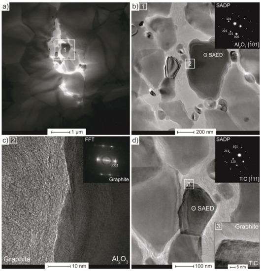 To reveal the nature of the observed structures, specimens were subjected to transmission electron microscopy observations. Figure 10a–d presents TEM analysis for composites with 2 wt.% of unmodified Ti3C2. Some highly porous areas (with several microns in size) are visible within the microstructure (Figure 10a), previously seen in SEM microstructures. The marked field no. 1 was magnified and further analysed. Figure 10b shows that the individual grains in this porous area are stretched on the other artificial material. In addition, the selected area electron diffraction performed from the pointed spot defines the grain as the Al2O3. The high-resolution TEM (HRTEM) image with fast Fourier transform pattern from field no. 2 (Figure 10c) reveals the presence of graphite. Similar observations were carried out for other porous areas, as presented in Figure 10d. In this case, the selective area diffraction pattern defines the grain to be TiC, which confirms the XRD results. The HRTEM image performed from marked field no. 3, discloses a good interface between titanium carbide and graphite. Such a good TiC–C bonding is probably an outcome of how these phases emerge. Sintering in a vacuum leads to the rearrangement of Ti and C atoms in MXene phase, as mentioned before [69]. It is important to note that the existence of such porous areas within the entire microstructure may be the reasons for the uncontrolled cracking of the specimens during mechanical properties testing.