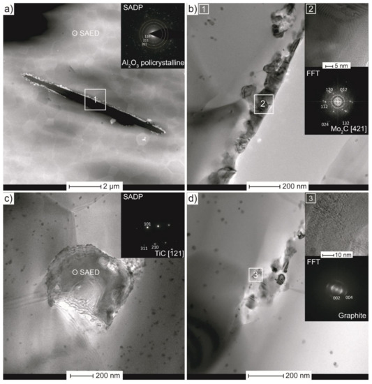 The TEM analysis for composites with 2 wt.% of molybdenum modified Ti3C2 is presented in Figure 11a–d. Some elongated voids, the size of few microns, can be observed in the microstructure, as shown in Figure 11a. Interestingly, bright particles are present at the edges of this void, which correspond to some heavy element (in HAADF mode, the detector shows mass thickness in contrast to signal intensity). The selective area electron diffraction performed from a bigger area obviously confirms the alumina as the matrix grains. To determine the occurring structures, field no. 1 was magnified and analysed. Figure 11b clearly shows an additional phase adjacent to the void. The high-resolution TEM image with fast Fourier transform pattern from field no. 2, reveals the presence of Mo2C, confirming the XRD analysis. These findings correlate well with the performed SEM observations. In the case of sinters with Ti/Mo modified phases, flake-shaped particles were present in the microstructure, and their size was equivalent to one of the elongated voids shown in the TEM image. However, the presence of free carbon and the absence of MXene peaks (revealed in XRD patterns), suggest that these voids are rather residues after graphite (than after Ti3C2 structures), which is being removed during specimen’s preparation. It might be due to weak bonding between metallic layers and initial MXene structures. In this study the Ti/Mo elements were sputtered onto Ti3C2 phase, thus the character of bonding is purely adhesive. This could be improved with the use of a method providing a chemical reaction, e.g., electroless plating, successfully applied for nickel coated graphene [73]. Similar to sinters with unmodified phase, SADP revealed the TiC particles within the microstructure, as shown in Figure 11c. It is important to note, that in this case there is no porosity at the grain boundaries. In addition, Figure 11d exposes an elongated structure between matrix grain. The HRTEM image with a FFT pattern from field no. 3 confirmed the presence of graphite. These findings suggest that applied modifications changed the way the MXenes degraded during the sintering process. In the case of composites with unmodified Ti3C2, porous areas consisting of TiC particles stretched on graphite arose. For sinters with modified MXene, except for the TiC phase, there is also the presence of elongated graphitic carbon structures.