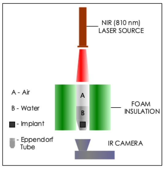 Photothermal Measurements. Figure 1 shows the experimental setup used for photothermal measurements. The sample (photoseed in 0.5 mL of deionized water or suspension of cells) contained in a 1.5 mL Eppendorf tube was irradiated by an NIR continuous laser at a wavelength, , of 810 nm (Photon Soft Tissue Diode Laser, Zolar Technology & MFG, Canada) with an external adjustable power, (0–3 W). The distance between the sample and laser was 4–5 cm and the laser spot diameter was 1 mm. The laser power range was between 0.5–1.0 W. Each sample was identically exposed for 5 min. The surface temperatures were also continuously captured with an infrared camera (E5 Thermal Imager, FLIR Systems Inc., Wilsonville, OR, USA). Additionally, the measurements were obtained in triplicates, except stated otherwise.